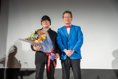 そして、マンガ寺子屋実行委員会の副委員長である河﨑館長より青山先生に花束贈呈をしてもらいました!